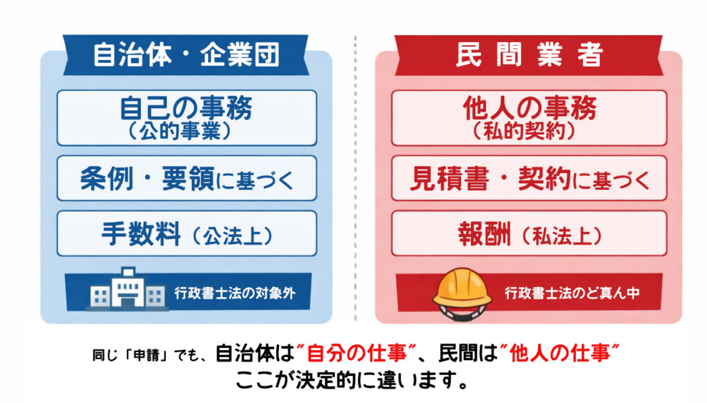 同じ「申請」という言葉を使っていますが、自治体がやっているのは自分の仕事(公的事業)。